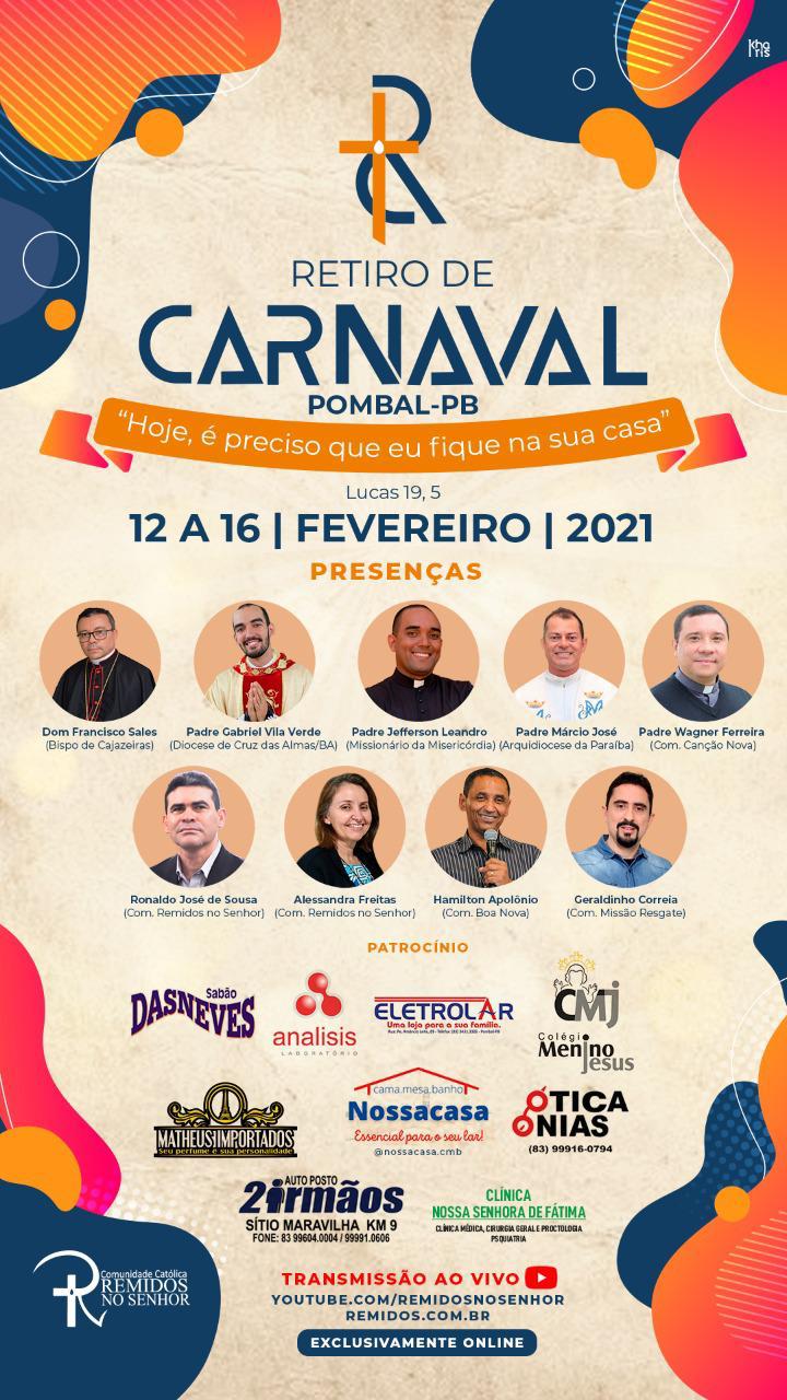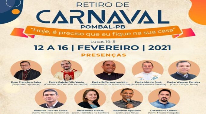 Convidamos as famílias de Pombal e demais cidades envolvidas no Retiro de Carnaval 2021 que preparem as suas casas para vivenciarem esses dias de graça e acolherem o Senhor que deseja ir ao encontro das nossas famílias, por meio de uma programação especial norteada pelo tema: “HOJE, É PRECISO QUE EU FIQUE NA SUA CASA” (Lc 19, 5).