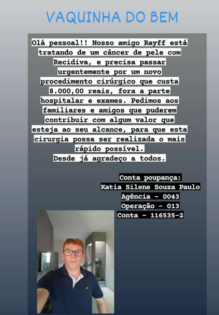 O senhor Rayff Nóbrega de Sousa, de São José de Espinharas, está se tratando de um câncer de pele e precisa passar urgentemente por um novo procedimento cirúrgico, que custa R$ 8 mil, fora a parte hospitalar e exames. Uma campanha está sendo realizada para que o valor seja alcançado.