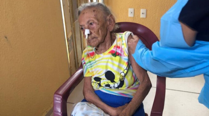 Aos 117 anos, Luiza Alves da Silva foi a primeira idosa acamada a se vacinar contra a Covid-19 em Sobral, no interior do Ceará. A imunização aconteceu na tarde desta terça-feira (26), com o lote das vacinas de Oxford/AstraZeneca que chegaram ao Ceará no sábado (23), e foram distribuídas para o estado.