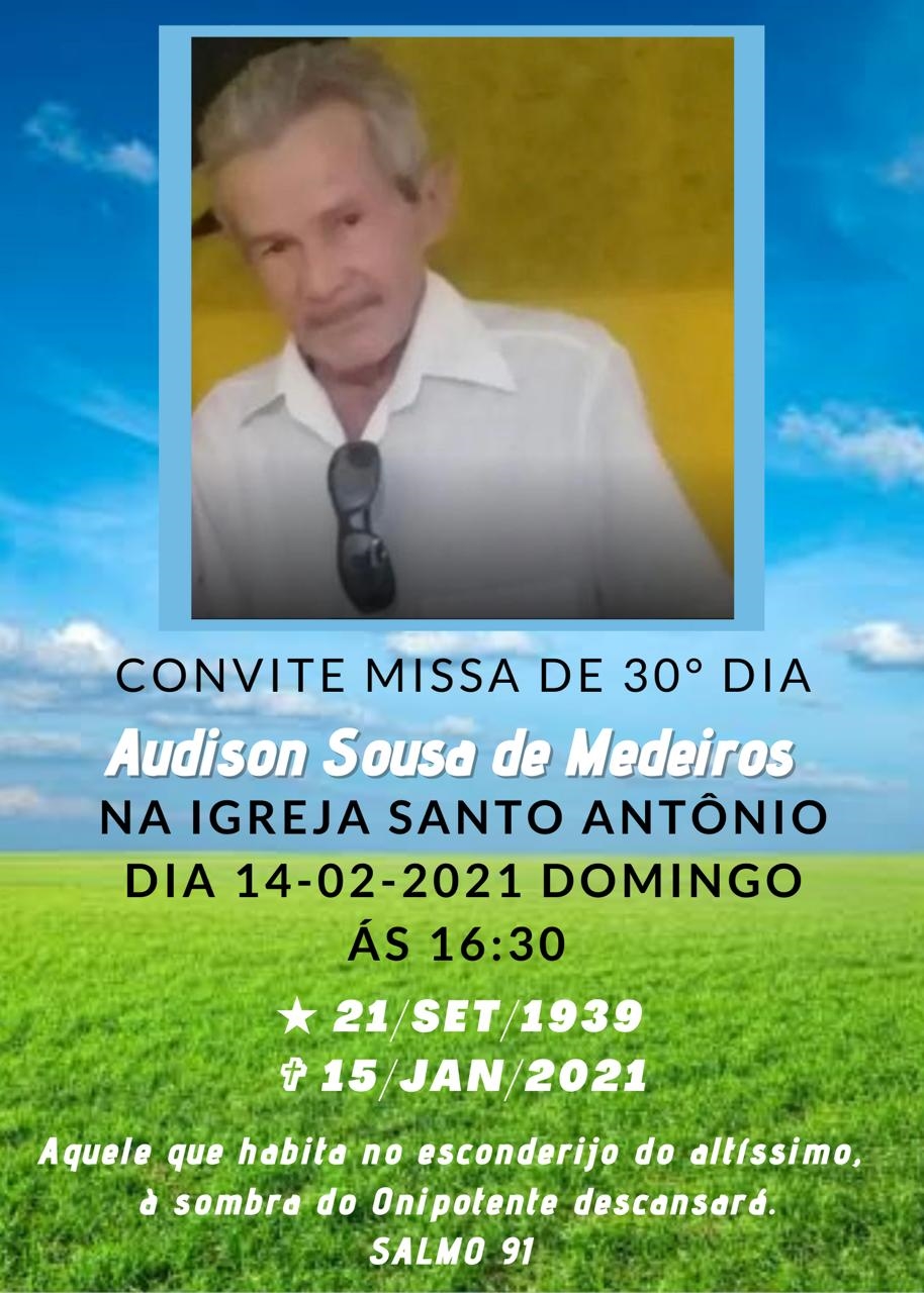 A família do senhor Audison Sousa de Medeiros convida parentes e amigos para participarem da missa de trinta dias que acontece às 16h30min deste domingo, 14/02, na Paróquia Santo Antônio, no bairro de mesmo nome, em Patos,