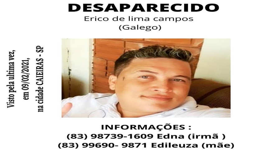 A família do jovem catingueirense Erico de Lima Campos, mais conhecido como Galego, utilizou as redes sociais para pedir ajuda na busca de informações que levem a sua localização.