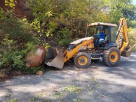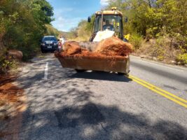 Madiel está com uma equipe desde às 4h30min no local, onde muita pedras caíram em decorrência das últimas chuvas, levando muito perigo para os motoristas.