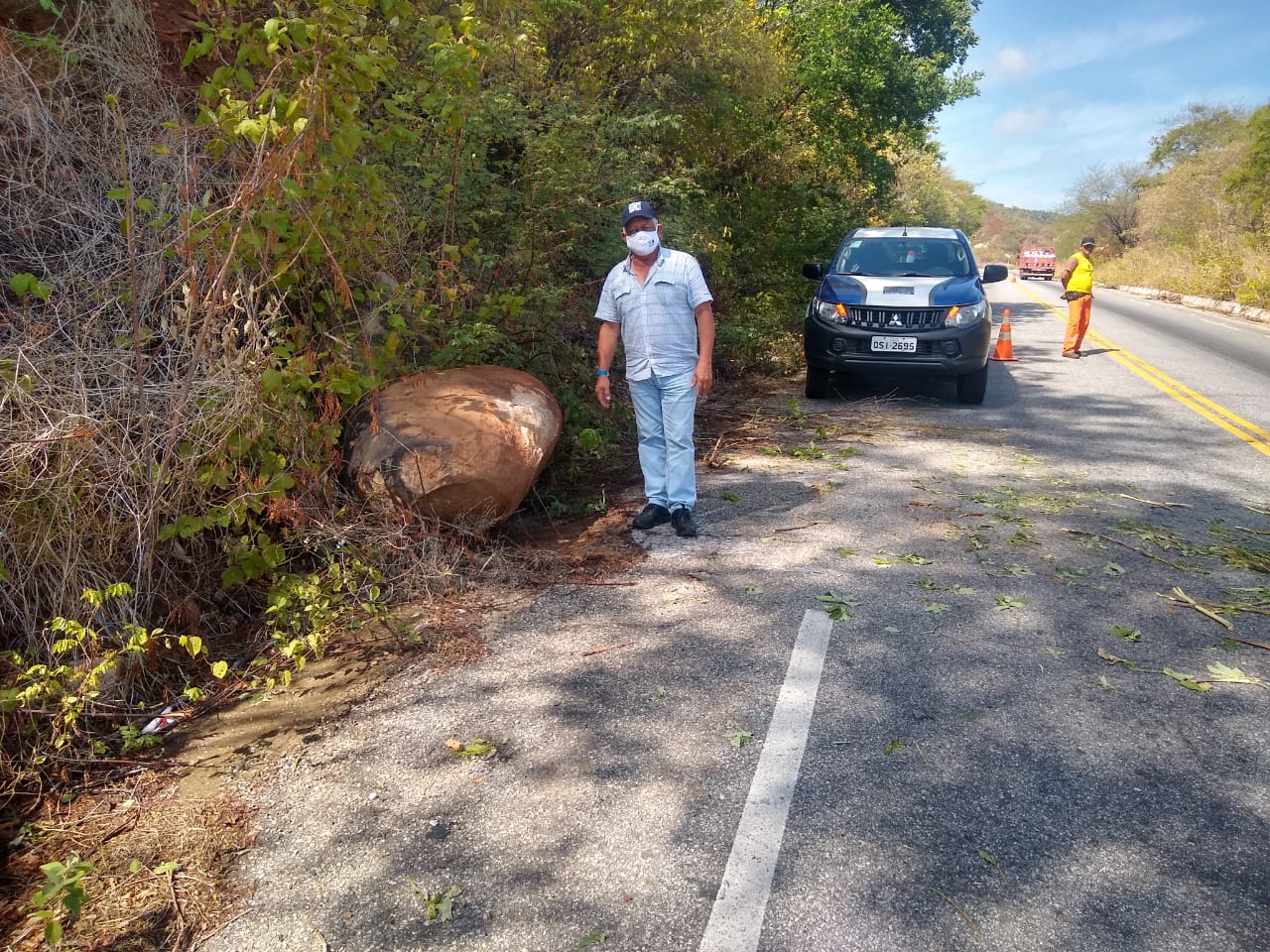 Madiel está com uma equipe desde às 4h30min no local, onde muita pedras caíram em decorrência das últimas chuvas, levando muito perigo para os motoristas.