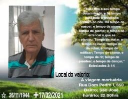 Faleceu por volta das 10 horas da manhã de ontem (quarta, 17/02), no Complexo Hospitalar Regional Patoense, o aposentado Murilo Vitor de Albuquerque Melo, mais conhecido como Murilão, de 76 anos, residente na Rua Antônio Félix, no São Sebastião, em Patos.