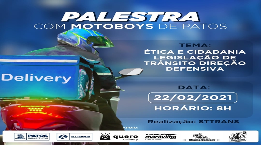 A Superintendência de Transportes e Trânsito de Patos, por meio da Coordenação de Educação para o Trânsito, realizará na próxima segunda-feira, 22 de fevereiro, palestra para os motoboys que trabalham no serviço de entrega por delivery em Patos.