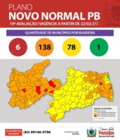 Na 19ª avaliação, 62% dos municípios paraibanos encontram-se em bandeira laranja, esboçando um crescimento expressivo de 527% em relação à 18ª avaliação, na qual cerca de 10% dos municípios encontravam-se nesta bandeira. Até a análise anterior, a Paraíba não tinha cidades em bandeira vermelha. Já na avaliação atual, que passa a vigorar nesta segunda-feira (22), os municípios de Igaracy, Catingueira, São José do Bonfim, São Mamede, Cuité de Mamanguape e Cacimbas compõem os 2,4% de localidades classificadas em vermelho, com recomendação de restrição de mobilidade e serviços.