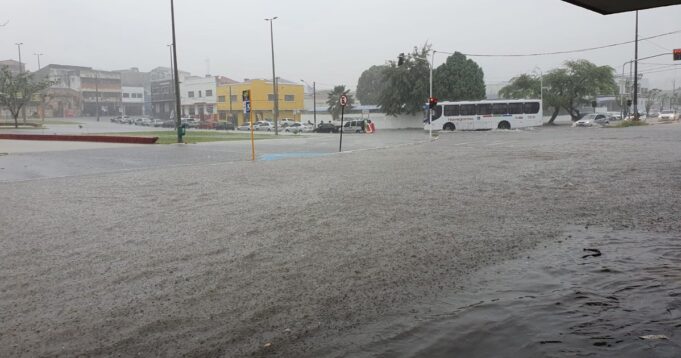 No tráfego em frente a Estação Ferroviária, o trânsito está totalmente parado. O local apresenta a via totalmente alagada.