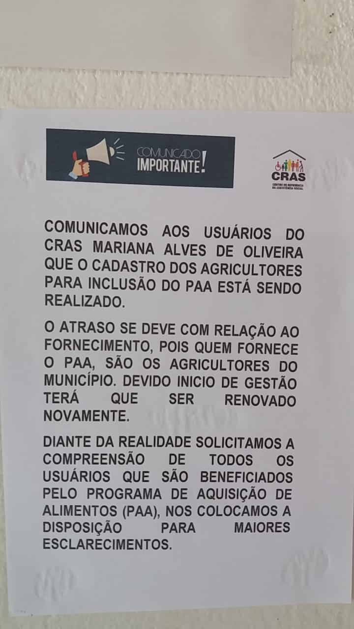 Comunicamos aos usuários do CRAS Mariana Alves de Oliveira que o cadastro dos agricultores para inclusão do PAA está sendo realizado.