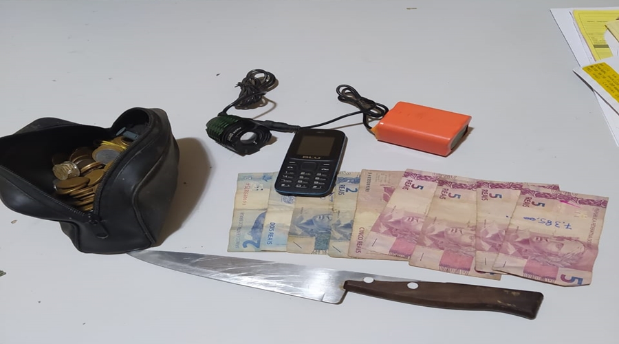 O suspeito de 20 anos estava portando uma faca peixeira, aproximadamente R$ 90,00 em moedas, R$ 33,00 em cédulas, um aparelho celular e uma lanterna de LED.