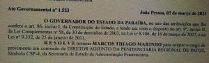 O soledadense Thiago Marinho foi nomeado pelo governador João Azevêdo (Cidadania), para assumir a secretaria adjunta da penitenciária Desembargador Romero Nóbrega, em Patos.