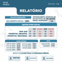 A Secretaria de Saúde de Patos, por meio da Vigilância em saúde, informa que até está terça-feira, dia 09 de março, a cidade de Patos totaliza 10.008 casos da Covid-19.