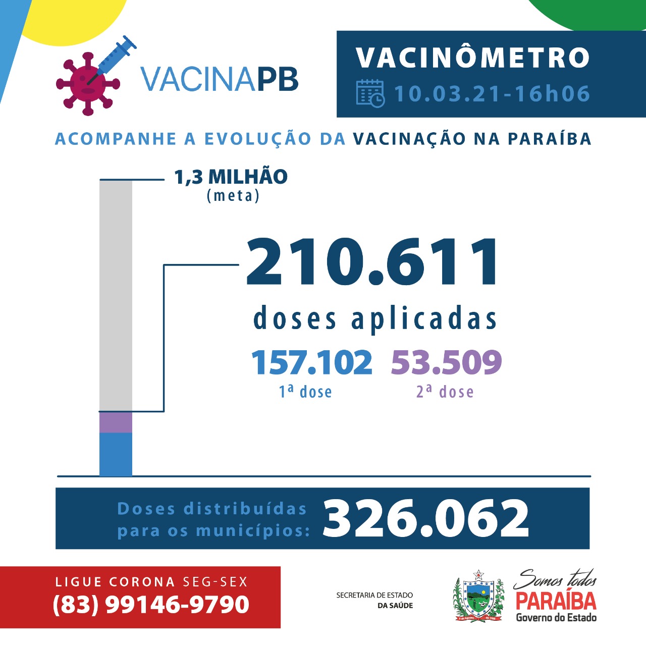 Foi registrado no sistema de informação SI-PNI a aplicação de 210.611 doses. Até o momento, 157.102 pessoas foram vacinadas com a primeira dose e 53.509 com a segunda dose da vacina.