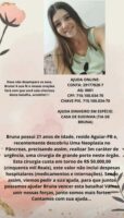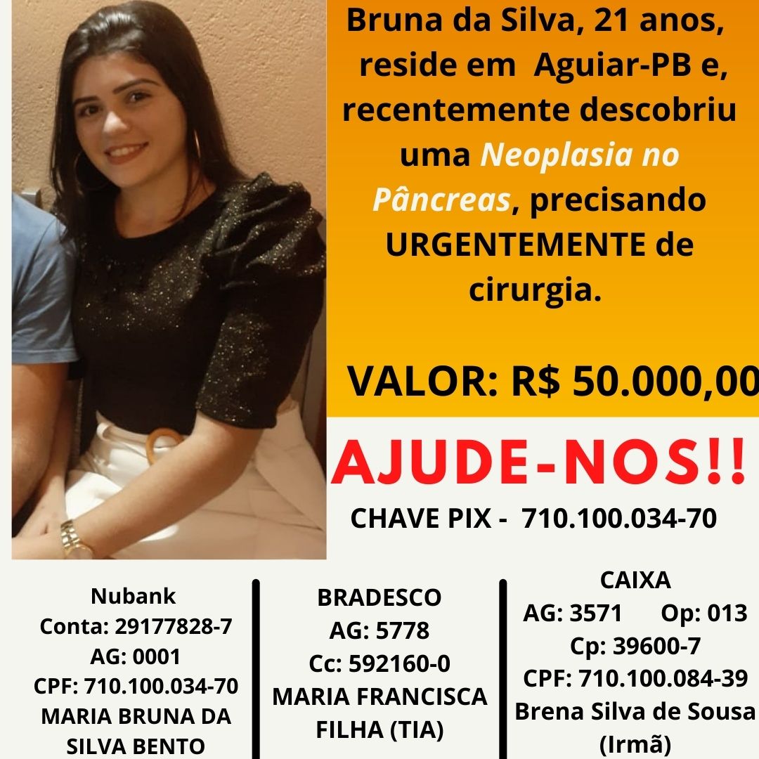 A jovem Maria Bruna da Silva Bento, de 21 anos, residente em Aguiar, no Vale do Piancó, recentemente descobriu uma neoplasia no pâncreas, e precisa realizar 3m de caráter de urgência, uma cirurgia de grande porte no órgão.