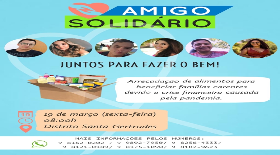 Nisso, o grupo formado por jovens do Distrito de Santa Gertrudes, em Patos (Luis, Ana Zilda, Luany, Juciely, Washington e Samuel) se unem para ajudar em forma de uma ação solidária com a arrecadação de alimentos.