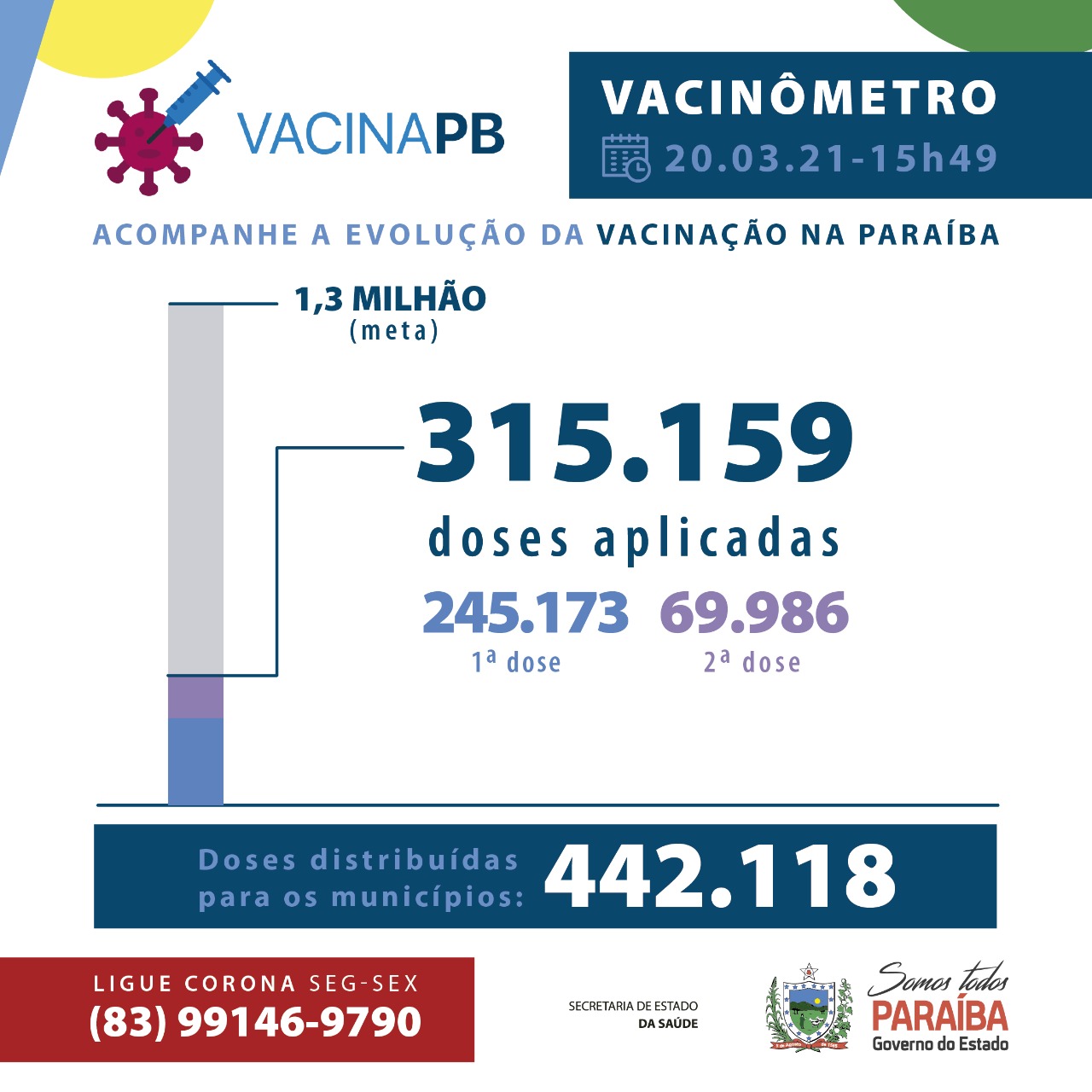 Foi registrado no sistema de informação SI-PNI a aplicação de 315.159 doses. Até o momento, 245.173 pessoas foram vacinadas com a primeira dose e 69.986 com a segunda dose da vacina. Um total de 442.118 doses já foram distribuídas.