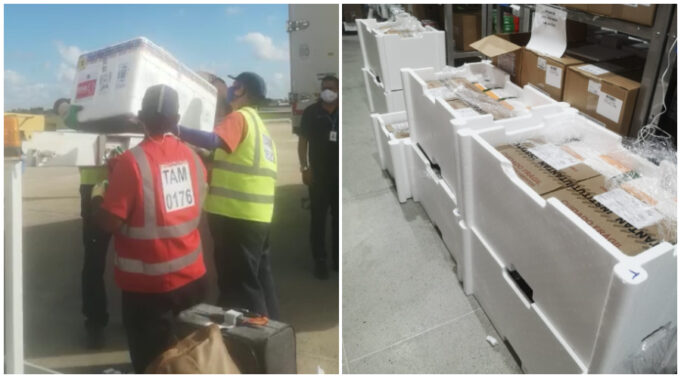 Mais 91.150 doses de vacina contra Covid-19 desembarcaram neste sábado (20) no Aeroporto Castro Pinto, na Região Metropolitana de João Pessoa. De acordo com a Secretaria de Saúde da Paraíba, a oitava remessa das vacinas fabricadas pelo Instituto Butantan e Fiocruz serão entregues aos 223 municípios nesta segunda-feira (22). Ao todo são 78.400 doses do Butantan e 12.750 doses da Fiocruz .