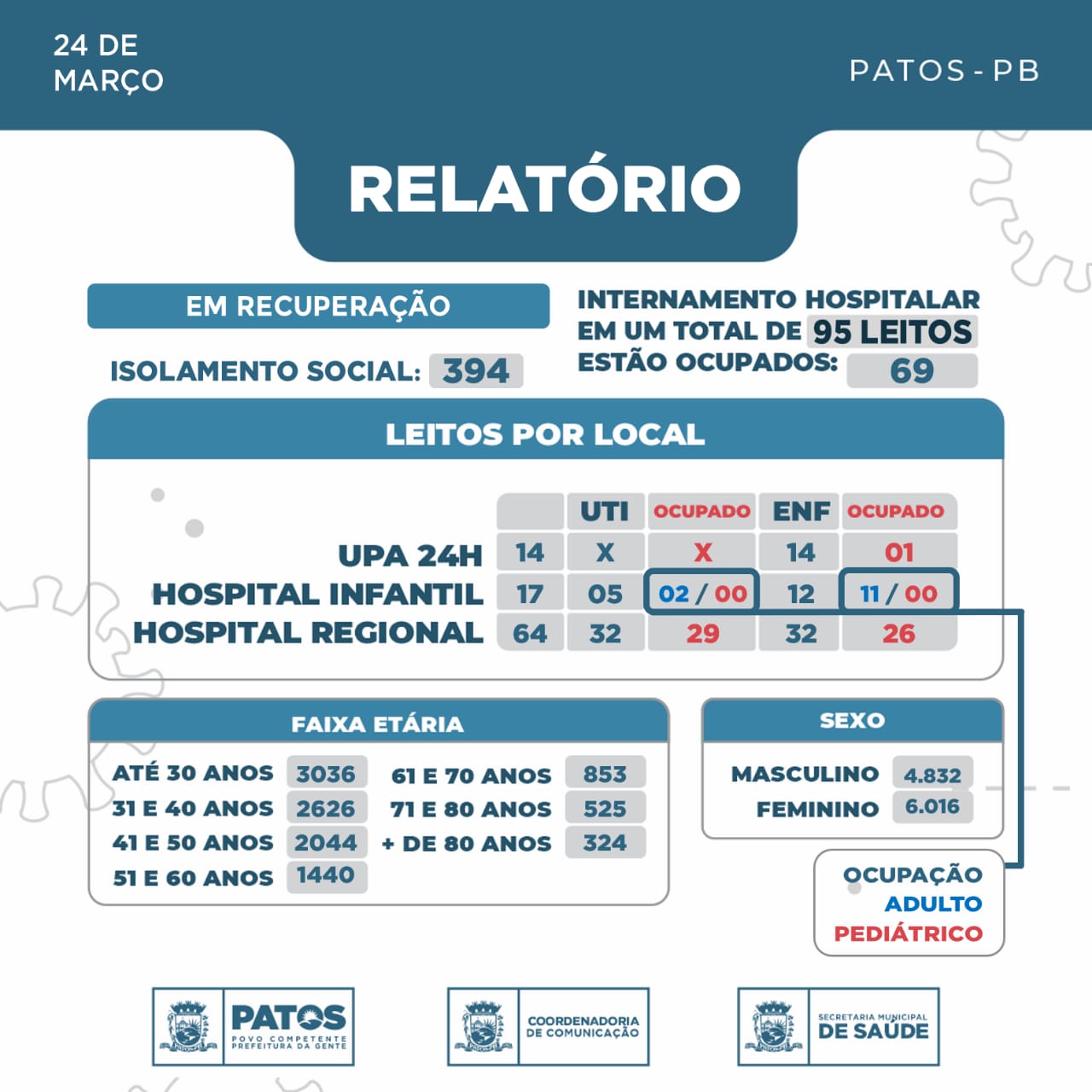 A Secretaria de Saúde de Patos, por meio da Vigilância em saúde, informa que até esta quarta-feira, dia 24 de março, a cidade de Patos totaliza 10.848 casos da Covid-19.