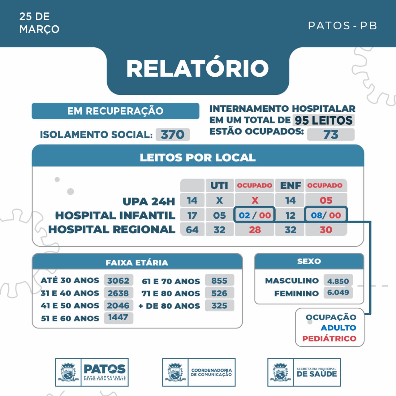 A Vigilância Epidemiológica da Secretaria de Saúde de Patos informa que até esta quinta-feira, dia 25 de março, a cidade de Patos totaliza 10.899 casos da Covid-19.