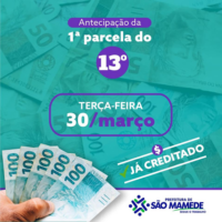 O prefeito de São Mamede, Dr. Umberto Jefferson, anunciou na tarde desta terça-feira, dia 30/03, de forma antecipada o pagamento da primeira parcela do 13º salário aos servidores públicos municipais.