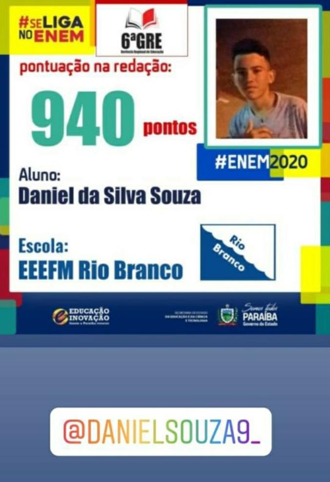 Daniel reside no Sítio Campo, zona rural de Patos, e estuda na Escola Estadual Rio Branco. Ele está recebendo as felicitações dos amigos e familiares pelo excelente desempenho na prova do Enem.