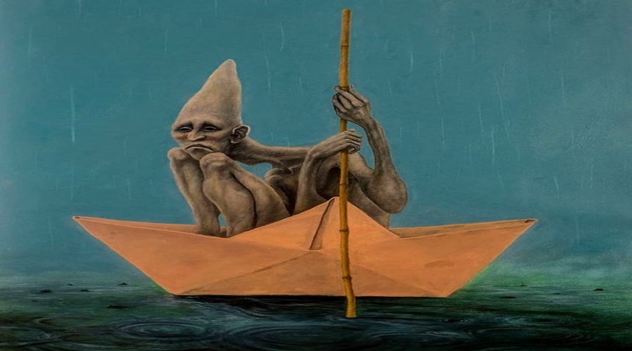 O olhar do homem no barquinho de papel exala sofrimento; segurado apenas por um leme no formato de vara, sem remo e sem rumo no mar da vida em meio às procelas da existência, que tentam afundar o barco da dor e da insensibilidade, que deriva na escuridão noturna.