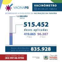 Foi registrado no sistema de informação SI-PNI a aplicação de 515.452 doses. Até o momento, 419.065 pessoas foram vacinadas com a primeira dose e 96.387 com a segunda dose da vacina. Um total de 835.928 doses já foram distribuídas.