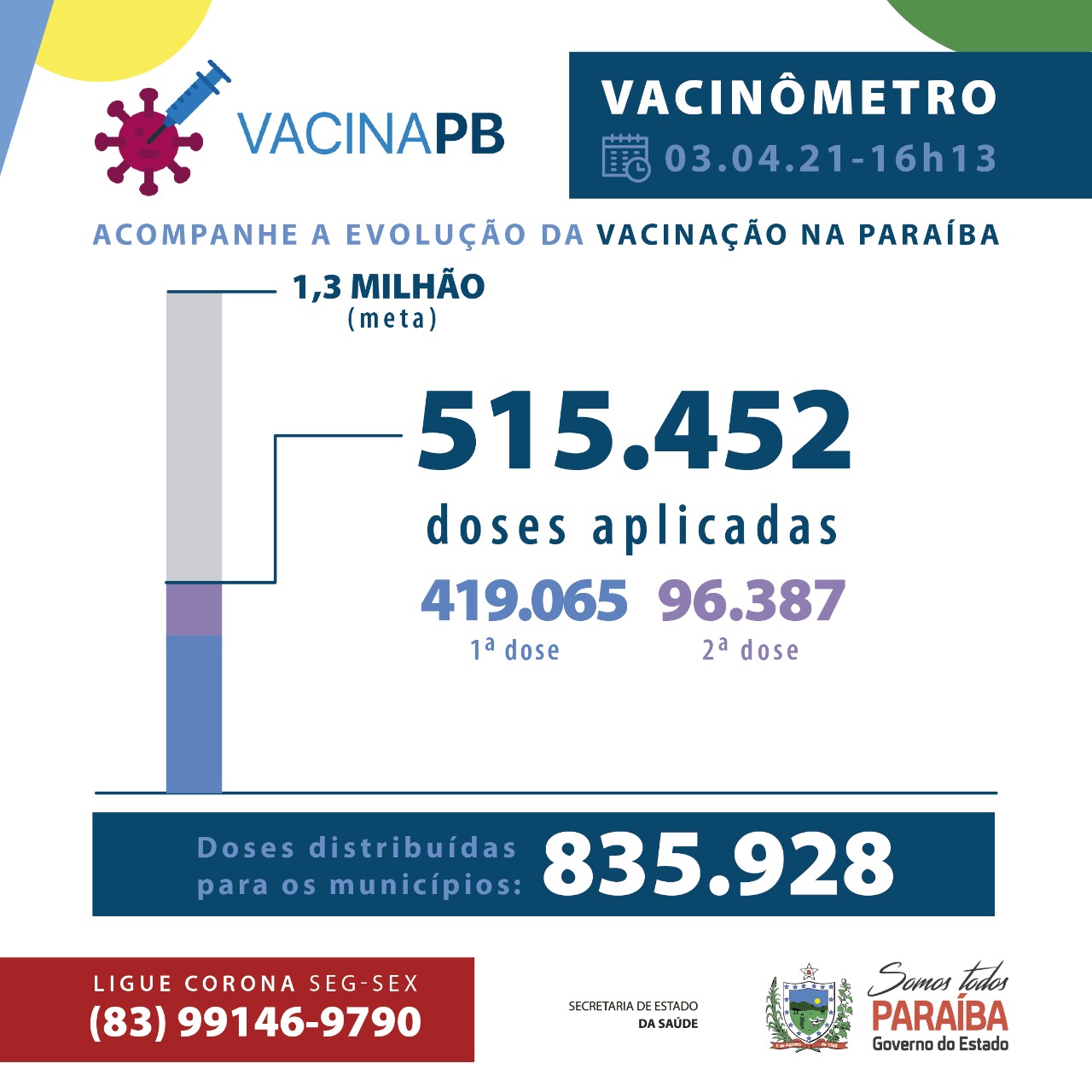 Os dados epidemiológicos com informações sobre todos os municípios e ocupação de leitos estão disponíveis em: www.paraiba.pb.gov.br/coronavirus.