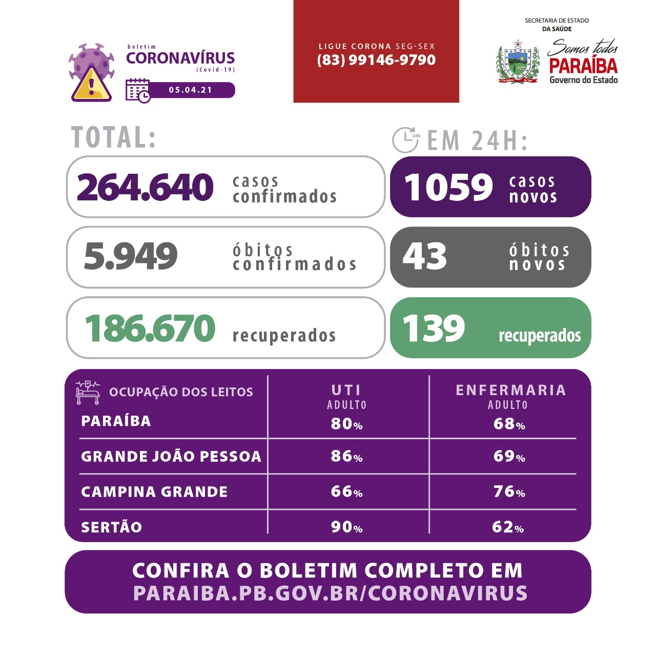 Os dados epidemiológicos com informações sobre todos os municípios e ocupação de leitos estão disponíveis em: www.paraiba.pb.gov.br/coronavirus.