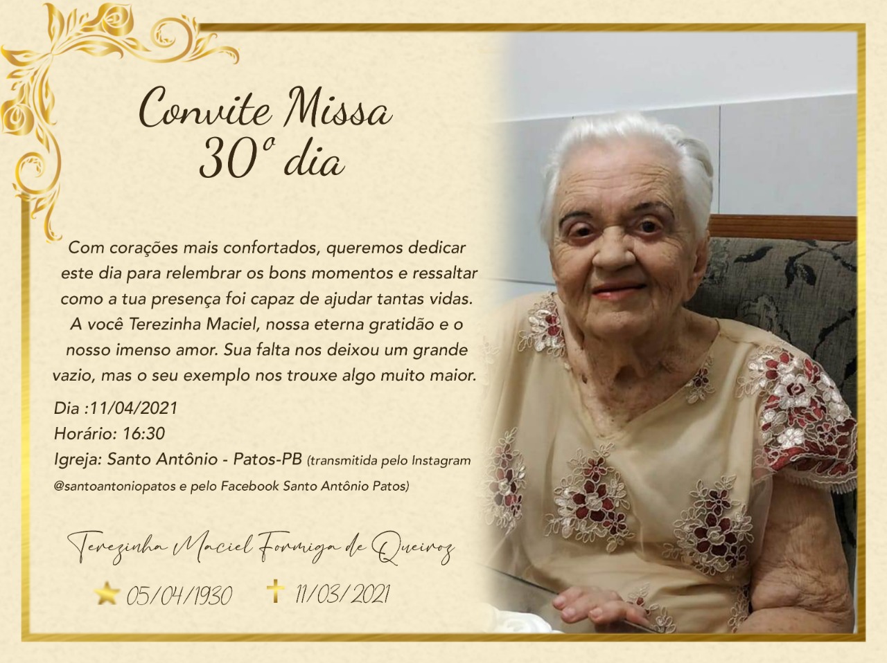 A família de Terezinha Maciel Formiga de Queiroz convida parentes e amigos para participarem da missa de 30 dias que acontece às 16h30min da manhã deste domingo, 11/04, na Paróquia Santo Antônio, no bairro de mesmo nome, em Patos,