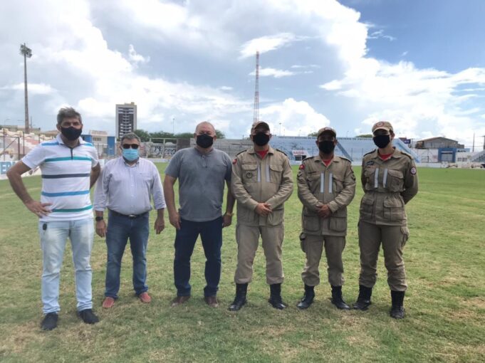 O secretário de Esporte e Turismo de Patos, José Francisco de Sousa (Zeca), o vice-prefeito Jacob Souto e administrador do Estádio de Futebol José Cavalcanti, Toinho Marques, acompanharam na manhã desta quarta-feira (14), uma visita técnica do tenente-coronel Oliveira, representando o Corpo de Bombeiros Militar da Paraíba.