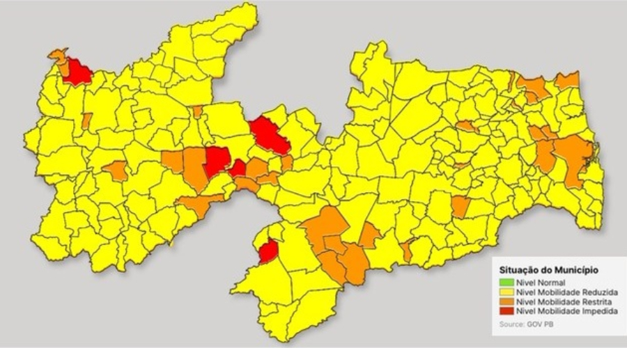 De acordo com a Nota Técnica, o período entre a 22ª e 23ª avaliações mostrou uma tendência de redução das taxas de transmissibilidade e de ocupação hospitalar dos leitos de terapia intensiva adulto em toda a Paraíba. Além da importante transição para bandeiras amarelas, oito municípios também se destacam por saírem da bandeira vermelha para a laranja, que atualmente representam 16%. Apenas cinco municípios seguem na bandeira vermelha, que são: Prata, Santa Terezinha, São José do Bonfim, São Mamede e Uiraúna. Assim como na 22ª avaliação, a Paraíba continua sem municípios na bandeira verde.