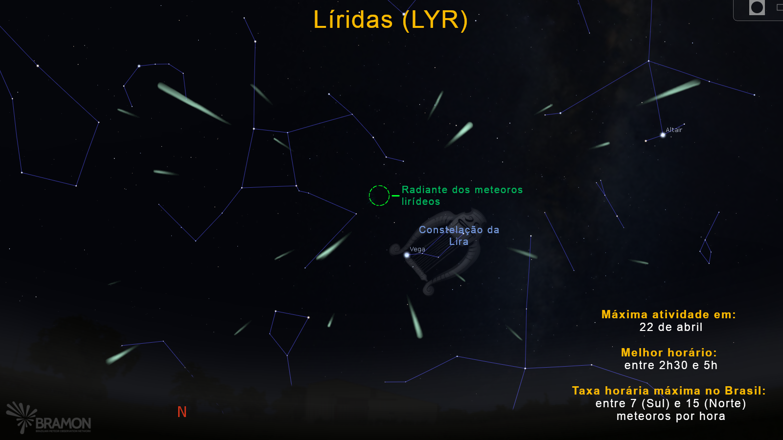 Como o radiante dessa chuva fica na Lira, que é uma Constelação da região Norte do Céu, ela é melhor observada nos países do Hemisfério Norte, onde deve apresentar até 18 meteoros por hora. Aqui no Brasil, quanto mais ao norte estiver o observador, mais meteoros terá chance de ver.