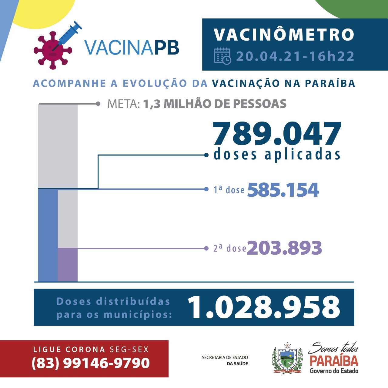 Foi registrado no sistema de informação SI-PNI a aplicação de 789.047 doses. Até o momento, 585.154 pessoas foram vacinadas com a primeira dose e 203.893 com a segunda dose da vacina. Um total de 1.029.630 doses já foram distribuídas.