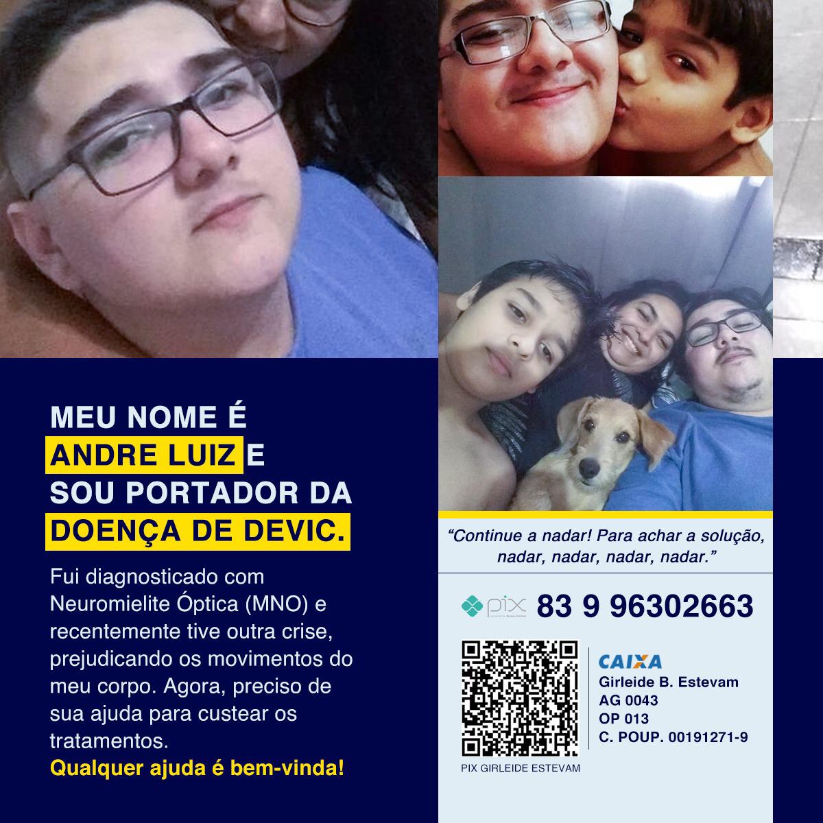 A família de André Luiz Cesar Oliveira Torres, de 29 anos, residente no Loteamento Nova Brasília, no bairro do Salgadinho, zona leste de Patos, está necessitando de ajuda para custear o tratamento de uma doença rara enfrentada pelo jovem, chamada de Síndrome de Devic, que afeta a cobertura protetora da medula espinhal e dos nervos ópticos.