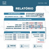 Desde o início da pandemia do novo coronavírus, a cidade de Patos registrou o total de 11.838 pessoas infectadas pelo vírus. Desses números, 181 pessoas foram a óbito, (01 óbito foi registrado nas últimas 24 horas) e 11.604 estão recuperadas.