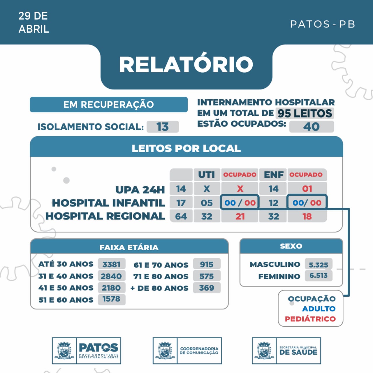 O Boletim Epidemiológico de Patos divulgado nesta quinta-feira, 29 de abril, pela Vigilância Epidemiológica informa que 11 pessoas foram infectadas pela COVID-19 nas últimas 24 horas. Além disso, 17 pessoas estão recuperadas nesse período, e 13 estão em isolamento domiciliar e 40 estão em internamento hospitalar.