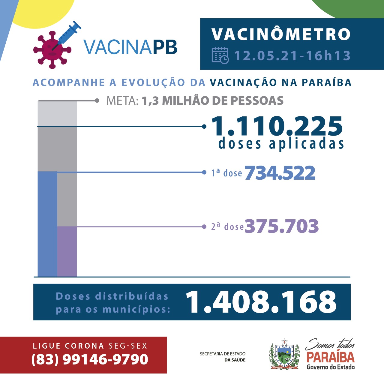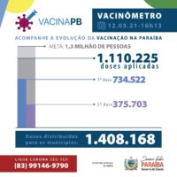 Foi registrado no sistema de informação SI-PNI a aplicação de 1.112.560 doses. Até o momento, 736.134 pessoas foram vacinadas com a primeira dose e 376.426 com a segunda dose da vacina. A Paraíba recebeu um total de 1.487.110 doses de vacina e 1.408.168 já foram distribuídas aos municípios.
