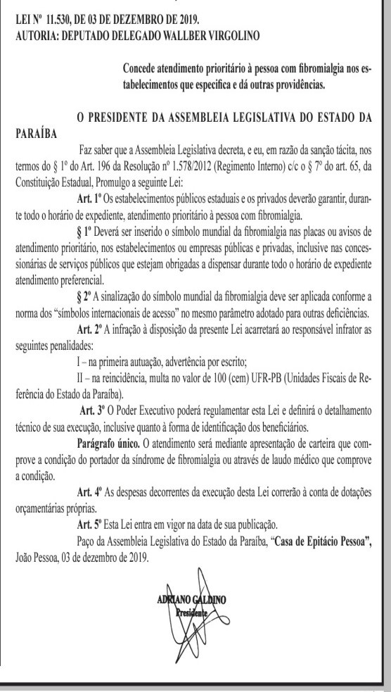 A lei estadual de Nº 11.530 de 03 de dezembro de 2019, de autoria do deputado estadual Walber Virgolino concede atendimento prioritário nos estabelecimentos públicos e privados durante todo seu horário de atendimento a pessoas com Fibromialgia, como também estabelece a inserção do símbolo mundial da Fibromialgia nas placas ou avisos de atendimento prioritário.