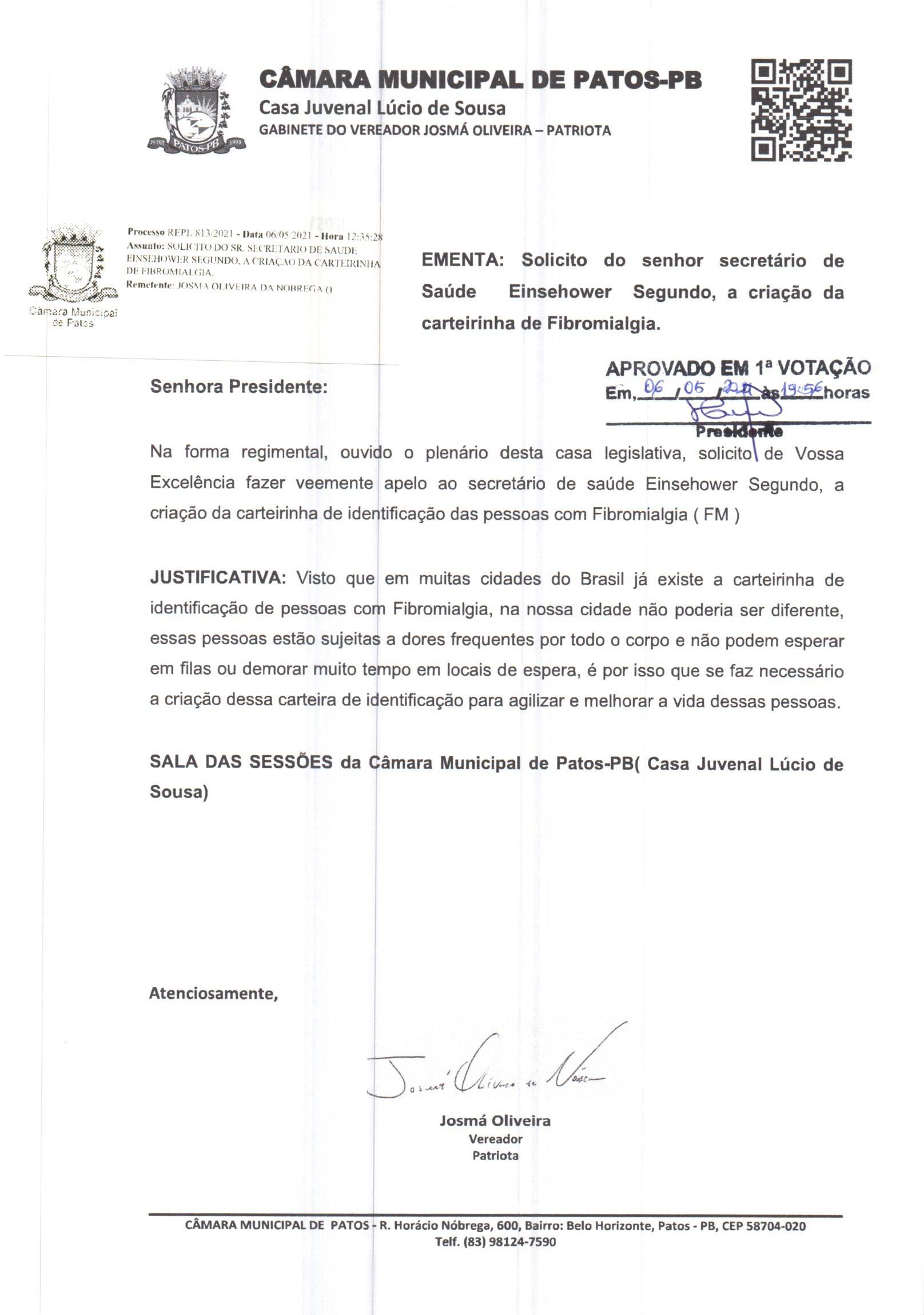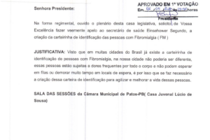 O vereador Josmá Oliveira atendeu o pedido da portadora de Fibromialgia Roberta e apresentou requerimento na Câmara de vereadores de Patos que logo fora aprovado, pedindo a confecção da carteirinha de portador de Fibromialgia, garantindo assim identificação no atendimento prioritário.