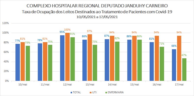 Um levantamento feito entre os dias 10 e 17 de maio, mostra que o setor de isolamento Covid do Complexo Hospitalar Regional Deputado Janduhy Carneiro (CHRDJC) teve uma taxa média de 92% de ocupação de leitos de UTI e de 75% dos leitos de Enfermaria Clinica Covid. Juntando os dois indicadores a média de ocupação geral dos leitos Covid ficou em 82%. Para o diretor geral da unidade, Francisco Guedes, os dados refletem uma realidade assustadora e comprovam a elevação do número de internações de pacientes com coronavírus.