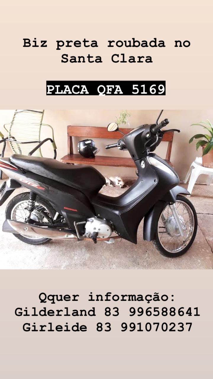 A proprietária de uma moto Honda Biz, placa QFA 5169, cor preta, está pedindo ajuda para recuperar seu veículo que foi roubado na tarde desta terça-feira (18), em Patos.