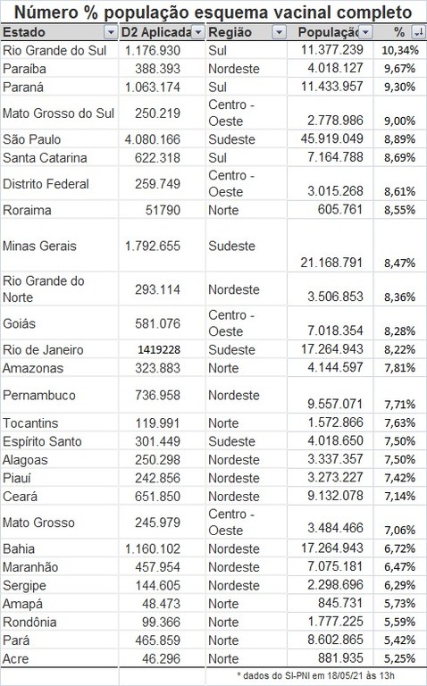 A Paraíba é o segundo ente federativo que mais vacina. Um comparativo de percentual de plenamente vacinados contra a Covid-19, com o esquema duas doses, aponta o estado com 9,6%, ficando atrás apenas do Rio Grande do Sul, com 10,3%. Na região Nordeste, o Rio Grande do Norte vem em segundo, com 8,36%, seguido de Pernambuco com 7,7%. Os dados são do Ministério da Saúde, e datam desta terça-feira, 18 de maio.