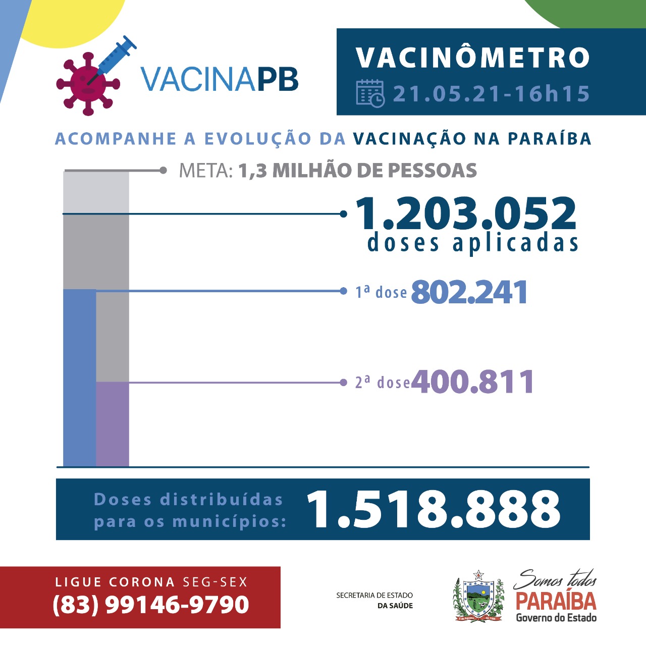 Foi registrado no sistema de informação SI-PNI a aplicação de 1.203.052 doses. Até o momento, 802.241 pessoas foram vacinadas com a primeira dose e 400.811 com a segunda dose da vacina. A Paraíba já distribuiu um total de 1.518.888 doses de vacina aos municípios.