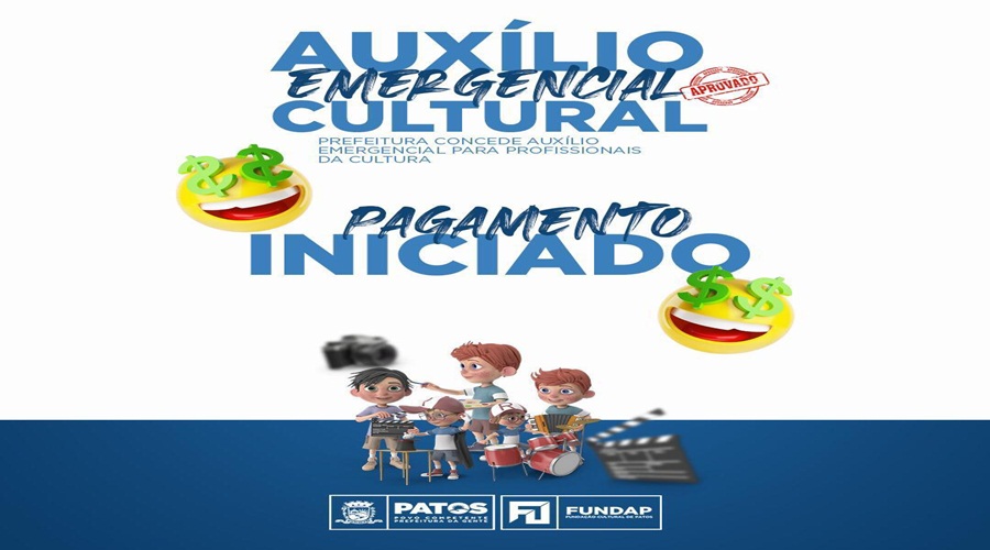A Prefeitura Municipal de Patos através da Fundação Cultural de Patos (Fundap) começa o pagamento hoje (24) da primeira parcela do auxílio emergencial voltado para os artistas e trabalhadores do setor cultural da cidade. O benefício soma um total de R$ 72.000.00 (Setenta e dois mil reais) distribuídos em três parcelas sucessivas de R$: 300,00 (Trezentos reais).