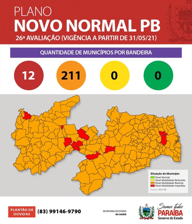 A 26ª avaliação mostra que 100% dos municípios paraibanos encontram-se nas bandeiras vermelha e laranja, com um expressivo crescimento de municípios classificados em laranja. Pela segunda vez ao longo de todo ciclo de avaliações não há municípios em bandeira amarela na Paraíba, a primeira vez foi na 22ª avaliação, no mês de abril. A Nota técnica com as informações, bem como as classificações de cada município e protocolos sanitários a serem adotados estão disponíveis no site: https://paraiba.pb.gov.br/diretas/saude/coronavirus/novonormalpb