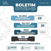 O Boletim Epidemiológico de Patos divulgado nesta terça-feira, 01 de junho, pela Vigilância Epidemiológica informa que 59 pessoas foram infectadas pela Covid-19 nas últimas 24 horas. Além disso, 36 pessoas estão recuperadas nesse período, e 614 estão em isolamento domiciliar e 88 estão em internamento hospitalar.