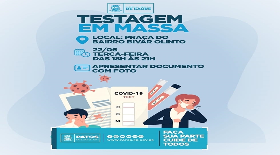As testagens em massa continuam na cidade de Patos por meio de ações descentralizadas e realizadas pela Prefeitura de Patos, por meio da Secretaria de Saúde e Gerência de Vigilância em Saúde.