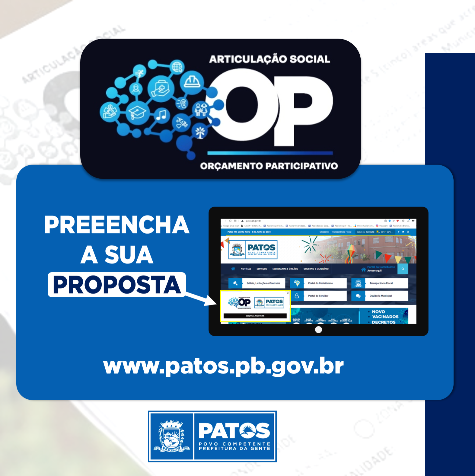 Se encerra nesta quarta-feira, 30, o prazo para a população patoense enviar as propostas para o Orçamento Participativo 2021. A Prefeitura Municipal de Patos por meio da Secretaria de Articulação Social, reforça o convite e a importância de que a população participe do OP 2021, para contribuir com a gestão indicando quais os locais de maior necessidade para a realização de investimentos.