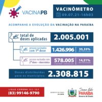 Foi registrado no sistema de informação SI-PNI a aplicação de 2.005.001 doses. Até o momento, 1.426.996 pessoas foram vacinadas com a primeira dose e 578.005 completaram os esquemas vacinais, onde 535.811 tomaram as duas doses e 42.194 utilizaram imunizante de dose única. A Paraíba já distribuiu um total de 2.308.815 doses de vacina aos municípios.