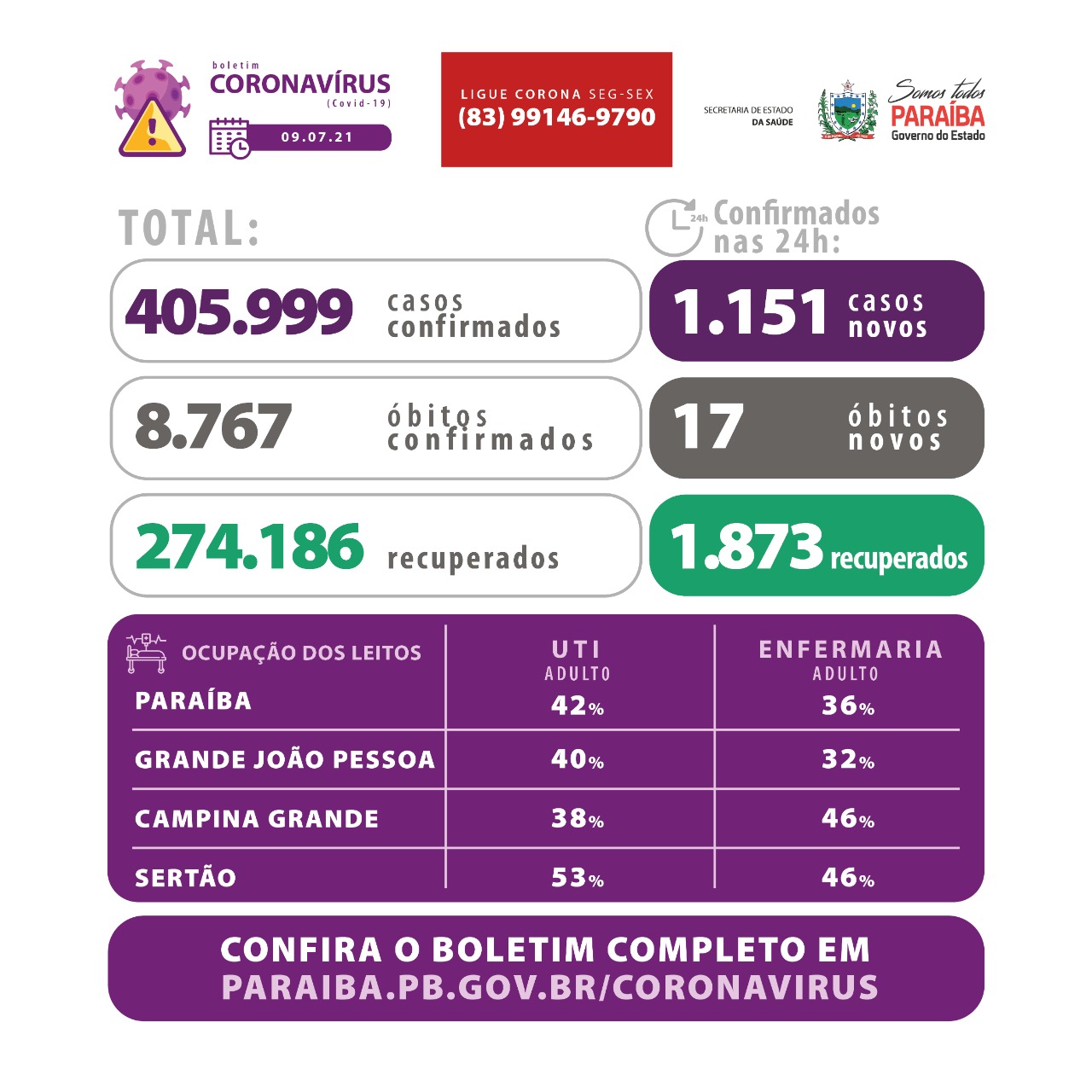 Os dados epidemiológicos com informações sobre todos os municípios, ocupação de leitos e cobertura vacinal estão disponíveis em: www.paraiba.pb.gov.br/coronavirus.